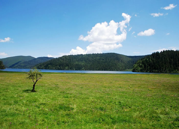 藏语“碧塔”是栎树成片的地方。藏语中碧塔海又意为宁静的海。在晴朗的日子里观赏春天的碧塔海,别有情致。湖畔四周,苍松古栎,遮天蔽日,碧塔海被黛色的群山环抱,像一颗镶嵌在群山中的绿宝石。湖水清澈明亮,在太阳缕缕金辉照耀下,闪闪熠熠,奇秀悦目。高山临湖,山光水色融为一体,真可谓“半湖青山半湖水”。湖周围杜鹃花绚丽灿烂,湖畔鸟语花香,游鱼游曳于浅滩岸边。从杜鹃花海中向外望去,在广阔的草甸上,成群的牛羊悠然徜徉于鲜花点缀的草甸上,湖光与草原由此相映成趣。