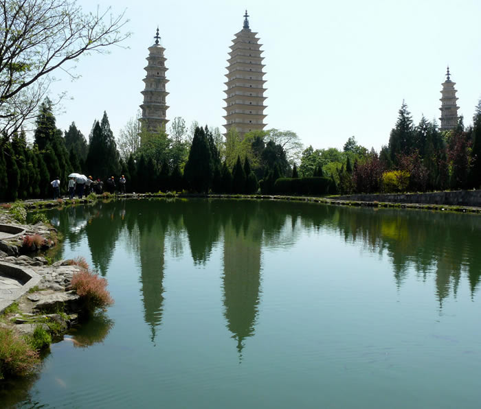 三塔相传建于南诏保和时期,近年来曾在塔顶发现南诏、大理中时期的重要文物600余件。南、北二小塔,位于主塔之后,两塔间距97.5米,与主塔相距70米,成三塔鼎足之势,两塔均为八斛形檐式空心砖,共10级,各高43米。崇圣寺三塔为第一批全国重点文物保护单位。
