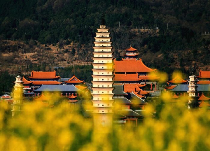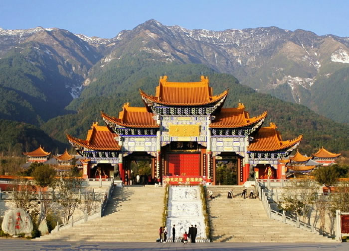 崇圣寺三塔,距离下关14千米,位于云南省大理以北1.5千米苍山应乐峰下,背靠苍山,面临洱海,三塔由一大二小三座佛塔组成,呈鼎立之态,远远望去,雄浑壮丽,是苍洱胜景之一。