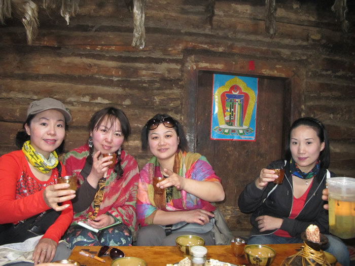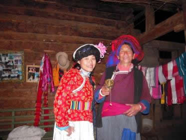 至今还保留着母系氏族形态和母系家庭生活习惯。这一奇特的民俗引起了全世界人类学家的关注,同时给摩梭人增添了奇异、神秘的色彩。摩梭人的房屋结构一般为四合院,全用圆木做成,摩梭人称它为“私鲁鱼垮”,意为木头房,也叫木楞房。房屋正房中间为老人房,即“老祖母房”,老祖母是摩梭家庭中身分地位最高的长者,掌管着家庭的财政和决策权。老祖母房集卧室、客厅、厨房为一体,房里有两根重要的房柱,左柱代表男,右柱代表女,男柱右侧一个佛台,摩梭家庭称它为“司土”,即“房心佛”。房内正中墙壁上挂有一块火神牌,它象征着母系家庭象火一样的旺盛,是家庭里的吉祥物,房内还放有摩梭人腌制的“猪膘肉”,又名“琵琶肉”。它是由整头猪腌制的,可以入一、二十年不变质,是摩梭人饮食中特产。“摩梭之家”这个风光秀丽、充满神秘色彩的地方,热情好客的摩梭姑娘载歌载舞,向贵宾献上酥油茶,为游客荡起“猪槽”船,一曲情深意长的“玛达咪”,使人久久不能忘怀。