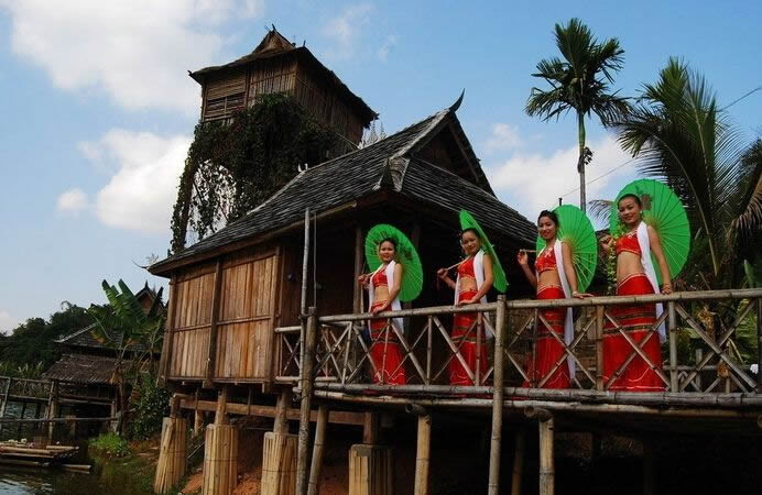 傣族村寨;景区内容的五个傣族村寨即曼将、曼春满、曼听、曼乍、曼嘎等,属于勐罕镇曼听办事处管辖。村寨为典型的傣族村寨,房屋建筑为“干栏”式竹楼,户与户之间竹篱为栏,自成院落。曼景兰村寨中,还有一条傣族风味食品街,游客可登临品尝,热情好客的主人用酸、辣、苦、甜、香、脆的傣族风味食品款待客人;让人们了解傣族的生活习俗,还可观看并参与傣族民间歌舞表演,购买到具有民族特色的傣锦、木雕、竹编、陶器等民间工艺品。