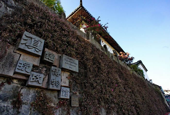 国殇墓园;大门为八字形古式门楼,门额镶有李根源所书“国殇墓园”四个大字,大门右侧挂有“滇西抗战纪念馆”的牌子。两侧粉墙上,分别绘有表状烈士精神的龙腾、虎跃形象,旁边有一方国务院颁立的全国重点文物保护碑。门后为一条长甬道,甬道两侧有新建的民族风格浓郁的陈列馆,分为两个展厅,展出反映腾冲抗战的实物100余件,纪实照片274张。陈列分“太平洋战争”、“腾冲抗战”、“腾冲人民对抗战的贡献”、“中印公路的建筑”、“腾冲战役中部分抗日将士事迹介绍”五个部分
